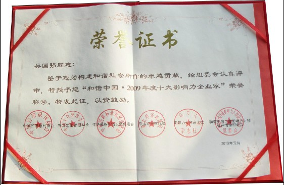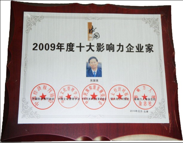 吳國強董事長榮獲“2009年度十大影響力企業家”稱號